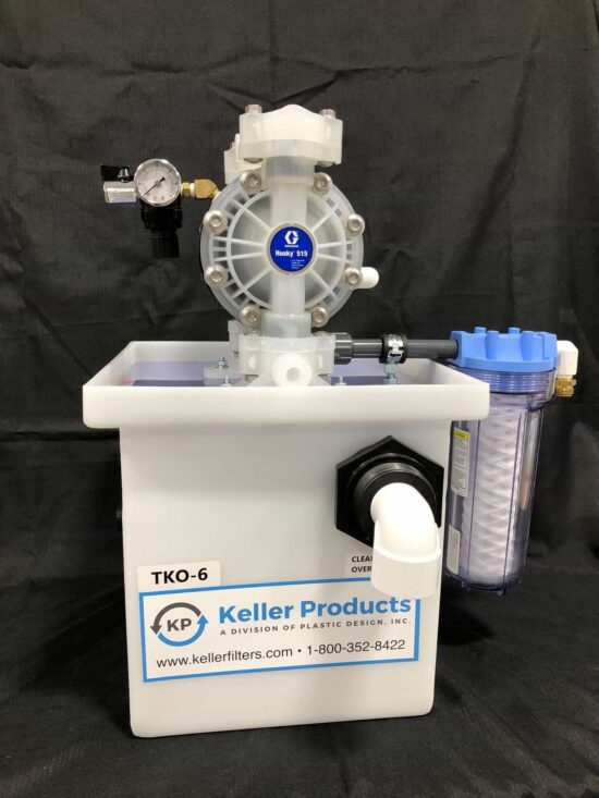 All TKO units employ a rugged 1/2″ air diaphragm pump. The TKO units are capable of filtering out solid contaminants as well as removing the free oil from the coolant.