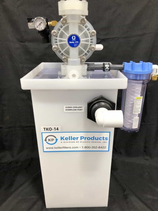 The TKO-6 patented tramp oil skimmer system is designed to continuously remove tramp oil from the coolant on a CNC machine tool. It is typically mounted to the side of the machine tool using the CLO-2 magnetic mounting bracket. All TKO units employ a rugged 1/2″ air diaphragm pump. The TKO units are capable of filtering out solid contaminants as well as removing the free oil from the coolant.