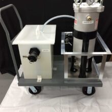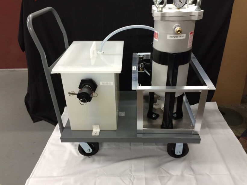 The Model 457 patented portable tramp oil skimmer system is designed to remove tramp oil and filter out solids from the coolant used in CNC machine tools. The unit features a large aluminum bag filter housing, rugged 1/2″ air driven pump, oil separation tank with coalescing package, mounted within a compact metal frame and secured to a cart.